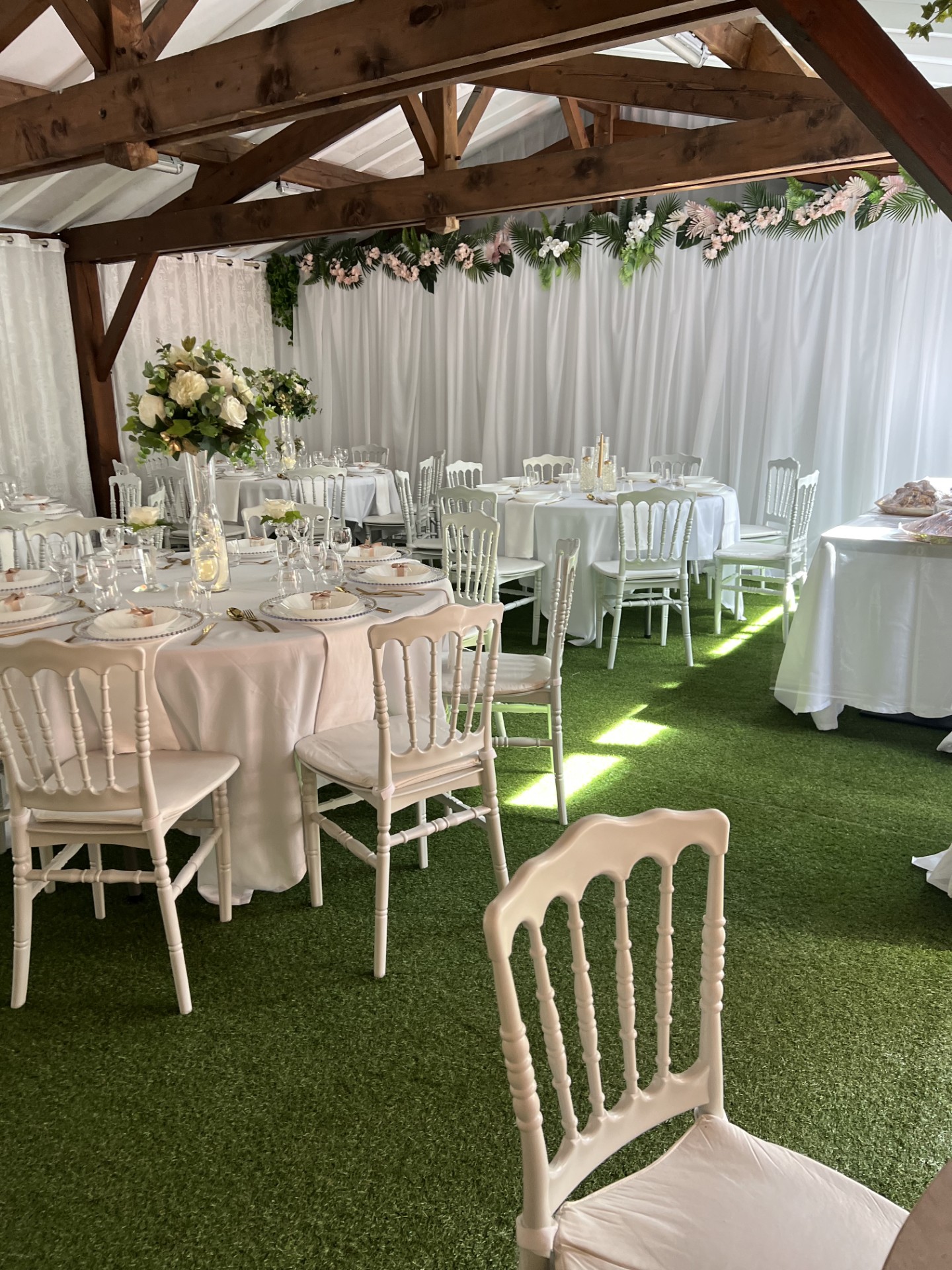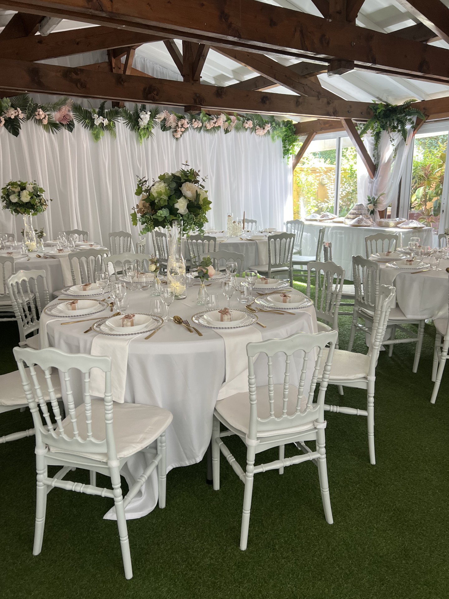 ✓ Chaises Napoléon blanches : Ces assises emblématiques ajoutent une touche d’élégance classique à votre événement.